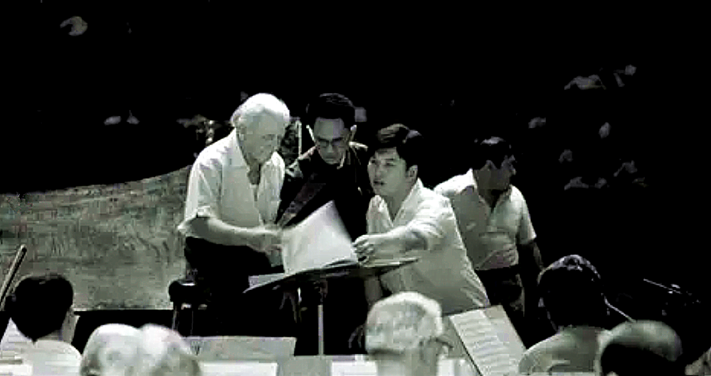 1973年9月,美国费城交响乐团指挥奥曼迪在和中央乐团的殷承中等人在研究乐谱 |